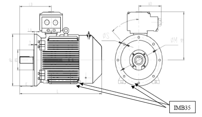 機座號 80-355 主接線盒位于電機頂部(從電機軸伸端看),出線口可四個方向調(diào)整,但 160中心高及以上接線盒出線口朝后(朝非軸伸端)時,由于吊環(huán)的影響,需在安裝現(xiàn)場,將電機吊裝到位后,取下吊環(huán),打開接線盒蓋,松開接線盒與機座聯(lián)接螺栓,將接線盒出線口朝后調(diào)裝。
